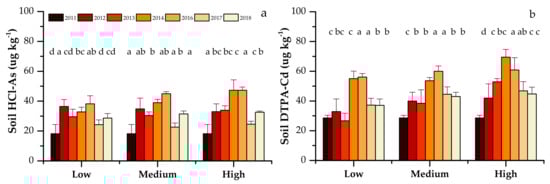 Soil HCl-As (a) and DTPA-Cd (b) of three treatments from 2011 to 2018. Different letters above the vertical bars indicate significant differences (p < 0.05).