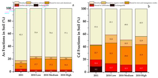 Forms of soil As (a) and Cd (b) in 2011 and in all three treatments in 2018. Percentage of As and Cd forms less than 2% are not labeled.