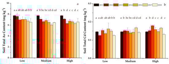 Soil total As (a) and Cd (b) contents in three fertilizer rate treatments from 2011 to 2018. Different letters above the vertical bars indicate significant differences (p < 0.05).