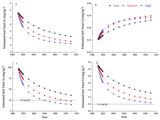 Estimated soil total As (a,c) and Cd (b,d) contents with continuous organic fertilizer application. Dotted line in a and c indicates a soil As risk screening value of 25 mg kg−1, while it indicates a soil Cd risk screening value of 0.6 mg kg−1 at soil pH > 7.5.
