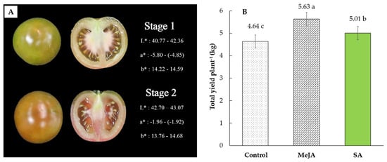 Harvesting stages (A) and total yield plant−1 (B) of ‘Kumato’ tomato cultivar in the control and treatment (0.25 mM MeJA and 0.5 mM SA) groups. The color of fruit was determined using the Hunter a* (redness), b* (yellowness), and L* (brightness) values.