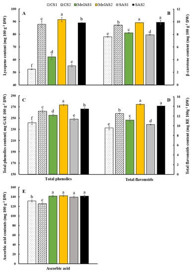 Lycopene (A), β-carotene (B), total phenolics (C), total flavonoids (D), and vitamin C (E) contents of ‘Kumato’ tomato cultivar in the control and treatment (0.25 mM MeJA and 0.5 mM SA) groups at two maturity stages. The bars with different letters indicate a significant difference (p < 0.05) between treatments. The vertical bars represent the standard error of the means (n = 5). CS1, CS2, MeJAS1, MeJAS2, SAS1, and SAS2 represent control, preharvest MeJA and SA treatments at S1 and S2 maturity stages, respectively.