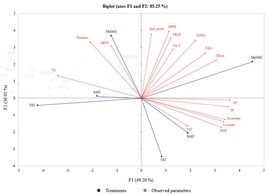 Principal component analysis explains the difference between the treatments and the observed parameters that largely affect the spatial distribution, and the correlation of the observed parameters []. The PCA of the observed parameters in this study is presented in Figure 3. TSS, TA, BAR, contents of lycopene, β-carotene, total phenolics, flavonoids, vitamin C, total amino acids, total essential amino acids, GABA, and antioxidant activities were used as variables to perform the PCA. The treatments were separated based on the above parameters, and factor 1 (F1) and factor 2 (F2) comprised about 85.25% of the total variance. F1 showed about 49.20% of the total variance and positively correlated to the total amino acids, total essential amino acids, GABA, vitamin C, the antioxidant activities (FRAP, DPPH, and reducing power), total phenolics and flavonoids, lycopene and β-carotene, BAR and TSS. As shown in Figure 3, the above parameters were also higher at S2 in preharvest MeJA-treated ‘Kumato’ tomato fruit followed by preharvest SA-treated and the control, respectively. The F2 accounted for about 36.05% of the total variance and mainly represented variances in firmness, TA and ABTS. The parameters represented in F2 were also higher in preharvest MeJA-treated ‘Kumato’ tomato fruit at S1. Taken together, the preharvest MeJA treatment showed a great impact on the measured parameters, mainly at S2 (Figure 3).
