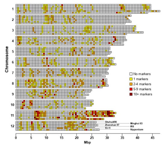 The forward and reverse primer sequences for 19,311 rice simple sequence repeat (SSR) microsatellite markers were downloaded from Gramene (Available online: www.gramene.org (accessed on 10 January 2019)) and were aligned against the six reference genome sequences using BLAST (Available online: blast.ncbi.nlm.nih.gov (accessed on 10 January 2019)).
