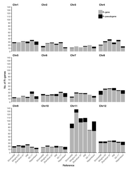 R-genes were identified on all 12 rice chromosomes of all the reference genomes. However, their distribution in the genomes is uneven and they tend to be found clustered together on chromosomes (Figure 1). The number of R-genes on each chromosome also varies greatly, ranging from 136 R-genes and R-pseudogenes on chromosome 11 of Minghui 63, down to 12 on chromosome 3 of Shuhui498 (Figure 2). Chromosome 11 had the highest number of R-genes for all reference genomes with between 18.3% (93-11) and 31.9% (Minghui 63) of the total complement of identified R-genes and R-pseudogenes.