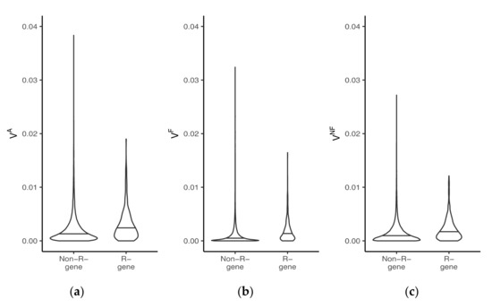 Differences in abundance of (a) all variations (VA), (b) functional variations (VF), and (c) non-functional variations (VNF) between R-genes (including R-pseudogenes) and non-R-genes of the Shuhui498 genome in the 75 indica rice lines examined. The shapes of the violins represent the distribution of the corresponding summary metric values calculated for the genes. Median values are indicated by the horizontal lines.