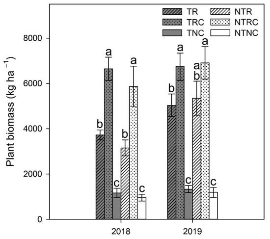 Plant biomass from winter growth in tilled (T) and no-till (NT) plots planted with rye only (R), rye plus crimson clover (RC), or no winter cover crop (NC) in April 2018 and 2019. Values represent the mean ± standard error. Statistical significance between treatments for each timepoint are denoted by different letters.