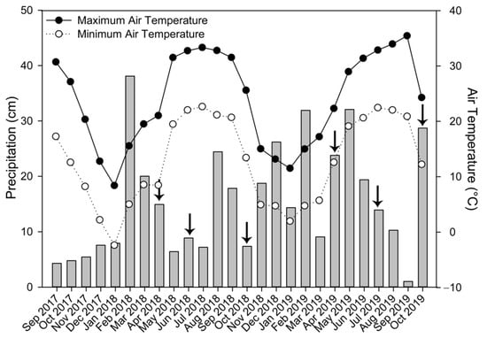 Monthly precipitation (bars) and average minimum (open circle) and maximum (closed circle) air temperature during the study period. Arrows indicate soil sample collection timepoints.