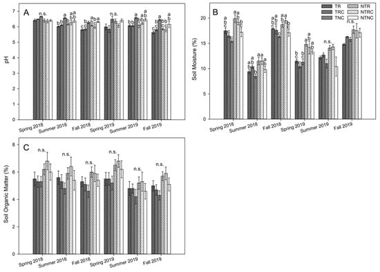 Soil pH (A), soil moisture content (B), and soil organic matter (C) in 0–5 cm depth from soybean study plots during 2018 to 2019 growing seasons. Values represent the mean ± standard error (n = 4). Statistical significance between treatments for each timepoint are denoted by different letters (α = 0.05). Timepoints marked with n.s. indicate no significant differences between pairwise comparisons.