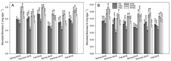 Two-way repeated-measures ANOVA indicated microbial biomass was enhanced by NT (MBC, p < 0.0001; MBN, p < 0.0001) and both cover crops treatments (MBC, p < 0.0001; MBN, p = 0.0057) in 0–5 cm soil throughout the study period (Figure 4), while no significant treatment effects were observed in the 5–15 cm depth (Table 2). This observation is consistent with prior observations of rye and crimson clover as individual treatments increasing MBC and MBN []. Similarly, conservation management incorporating rye cover crops also increased microbial biomass relative to conventional management practices in monoculture wheat and wheat-bean-potato rotations []. Interestingly, while cover crop-based differences in the current study were apparent in NT plots throughout the growing season, differences between cover crop and no cover in T plots were not significant in the spring timepoints prior to cover crop termination. They became more pronounced later in the growing season of both years (Figure 4), possibly the result of the organic matter input from degrading cover crop residues stimulating microbial growth in soils. Consistent with this, correlations between microbial biomass levels and yearly cover crop biomass inputs peaked in the summer timepoints (Table 3) while they were not significant in spring timepoints prior to cover crop termination before the start of cover crop decomposition, or the fall timepoint after the bulk of cover crop residues had been degraded. In addition, both MBC and MBN correlate significantly with SOM (Table 4).