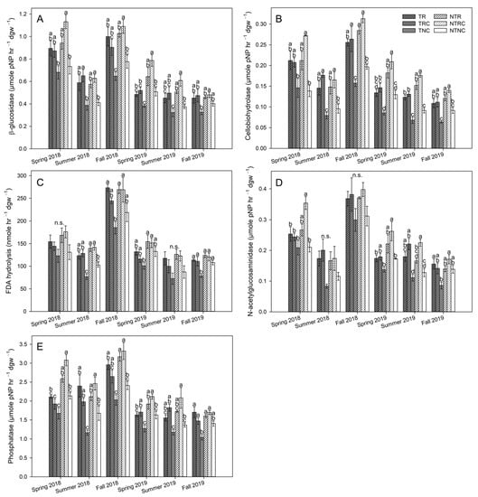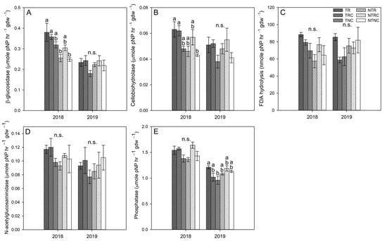 Activities of β-glucosidase (A), cellobiohydrolase (B), FDA hydrolysis (C), N-acetylglucosaminidase (D), and phosphatase (E) in 0–5 cm soil from till (T) and no-till (NT) plots planted with winter cover crop treatments of rye only (R), rye+clover (RC), and no cover (NC) during the 2018 and 2019 soybean growing seasons. Values represent the mean ± standard error. Statistical significance between treatments for each timepoint are denoted by different letters (α = 0.05). Timepoints marked with n.s. indicated no significant differences between pairwise comparisons.