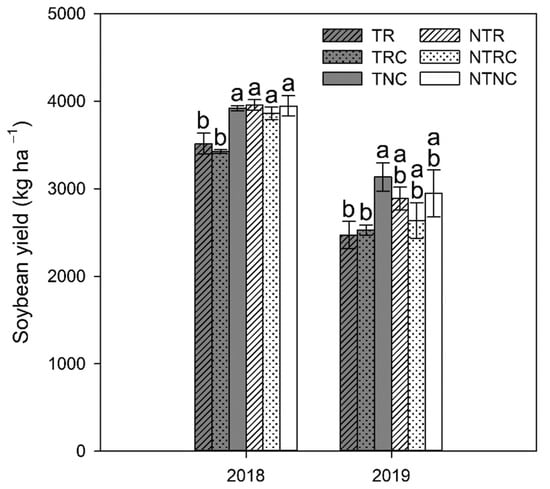 Soybean yield in till (T) and no-till (NT) plots planted with winter cover crop treatments of rye only (R), rye+clover (RC), and no cover (NC) during the 2018 and 2019 soybean growing season. Values represent the mean ± standard error. Statistical significance between treatments for each timepoint is denoted by different letters (α = 0.05).