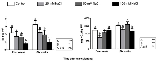 The level of nitrates in the leaves was unaffected by sampling time, despite the significant influence of salinity (Figure 2, right). On the other hand, a strong interaction between the two factors was found for the nitrate content, similarly to the content of carotenoids and unlike all the other parameters determined in this work. Moreover, an extremely low linear correlation coefficient (0.05) was obtained between NaCl concentration and the content of nitrate, which was in the range 1500–3200 mg NO3−/kg FW. Compared with the control, the leaf nitrate content was significantly lower with the 25 mM treatment at both sampling times and with 100 mM NaCl after six weeks of cultivation (Figure 2, right).