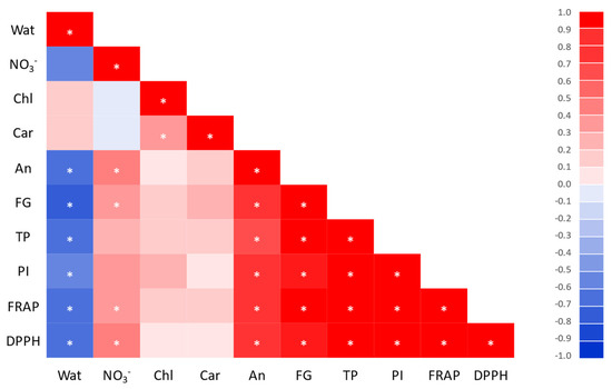 Pearson’s coefficients for quality parameters of the fresh leaf tissues of Reichardia picroides plants grown in floating system with different NaCl concentrations in the nutrient solution (1.7, control; 25; 50; 100 mM) and sampled four and six weeks after transplanting. Four replicates were collected for each treatment and sampling time. Wat: water content; NO3−: nitrates; Chl: total chlorophylls; Car: carotenoids; An: anthocyanins; FG: flavonol glycosides; TP: total phenols; PI: phenol index; FRAP: ferric reducing antioxidant power; DPPH: 2,2‒diphenyl‒1‒picrylhydrazyl radical scavenging activity. * denotes statistical significance at p < 0.05.
