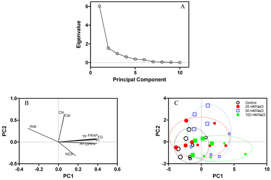 Principal Component Analysis (PCA) for quality parameters of fresh leaf tissues of Reichardia picroides plants grown in floating system with different NaCl concentrations in the nutrient solution (1.7, control; 25; 50; 100 mM) and sampled four and six weeks after transplanting. (A): scree plot; (B): plot of component weights (water content, Wat; total chlorophylls, Chl; carotenoids, Car; flavonol glycosides, FG; total phenols, TP; phenol index, PI; ferric reducing antioxidant power, FRAP; 2,2‒diphenyl‒1‒picrylhydrazyl radical scavenging activity, DPPH; anthocyanins, An; nitrates, NO3); (C): scatterplot of data obtained after the first (large symbols) and second (small symbols) sampling.
