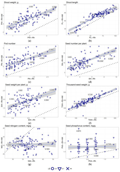Scatterplots of traits as measured for analyzed pea cultivars grown under single inoculation with rhizobia (x-axis, Rh) and double inoculation with rhizobia and AM fungi (y-axis, Rh + AM). The blue line is the linear regression graph; the dotted line is the y = x graph, representing the hypothetical absence of difference between inoculations. The following traits are presented: (a) PW—shoot weight, g; (b) PL—shoot length, cm; (c) PN—pod number; (d) SN—seed number per plant; (e) SW—seed weight per plant, g; (f) TSW—thousand-seed weight, g; (g) NtS—seed nitrogen content, mg/g; (h) PhS—seed phosphorus content, mg/g.