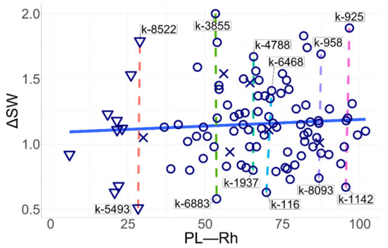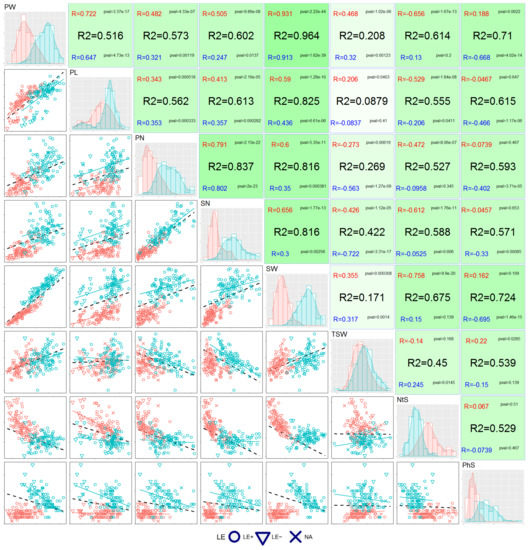 In the αPL–PL-Rh plot, we noticed a separation of dots into two clusters corresponding to short and tall plants, and the shorter plants were characterized by wider spread of αPL. In pea, one of the genes that determine the stem length is Le, which encodes gibberellin 3-beta-dioxygenase [26]. The natural mutation le (p.A229T) causes shortening of the internodes, while an intact copy of the gene determines the normal length of internodes and a whole plant. We genotyped cultivars by Le allele (Supplementary Table S3, see below) and used its allelic state as a factor in regression models connecting traits’ absolute and relative increments with trait values. The results showed that the Le/le allele status affected absolute increments of SW, PL, TSW, NtS, and PhS (p-value < 0.05) and relative increments of PW, PL, PN, TSW, NtS, and PhS (p-value < 0.05) (Supplementary Figure S1), which implies that plant length might influence pea responsivity to AM inoculation. However, it is worth noting that le− cultivars accounted for only approximately 10% of the analyzed pea genotypes. Therefore, further analysis of a set of pea cultivars with equal ratio of Le+–le− plants is needed to support the present result.