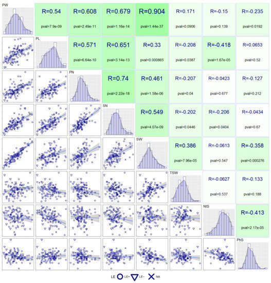 To evaluate the correlations between traits within experimental treatments, we performed (1) Pearson correlation analysis under both experimental conditions (Rh and Rh + AM inoculation) and (2) regression analysis with a model combining both conditions as a factor. The scatter plots, correlation coefficients (R), and coefficients of determination (R2) are presented in Figure 2. The values of PW, PL, PN, SN, and SW were significantly correlated with one another under both experimental conditions. The SW trait demonstrated the strongest correlation with other mentioned traits, PW, PL, PN and SN, with a level of determination reaching 96% for PW. Further, this group of parameters showed an interesting pattern of relationship with nitrogen content (NtS) and phosphorus content (PhS) in seeds: a negative correlation with NtS and no correlation with PhS under Rh inoculation (Figure 2), and, oppositely, no significant correlation with NtS (except weak negative correlation for PL) and negative correlation with PhS under double inoculation with Rh + AM. The TSW trait had the least relation with other parameters, which is in line with the observation that seed size is highly genetically determined and is faintly affected by mycorrhizal fungi. However, the values of TSW positively correlated with PL and PW and negatively correlated with PN and SN (Figure 2).