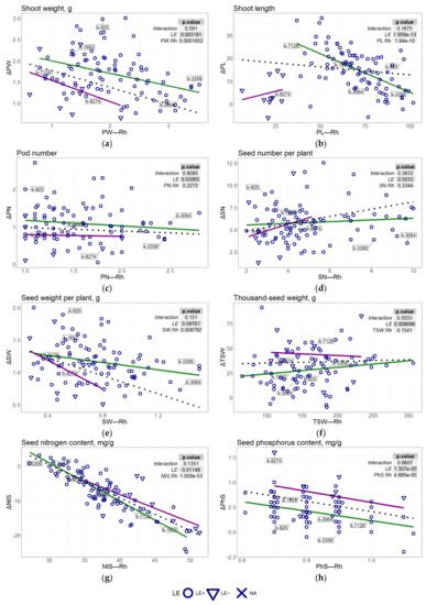 Scatterplots of AM-caused trait increments (∆T, y-axis) against trait values of plants grown under single inoculation with rhizobia (TRh, x-axis). The lines represent the approximation of the two-variable regression model with variable interaction (∆T~TRh * LE); the green line is for LE+ cultivars, the purple line is for LE- cultivars, and the dotted line represents ∆T~TRh dependency excluding LE factor. In the tables, the results of statistical tests for significance of two factors, TRh and LE, and their interaction are presented. The following traits are shown: (a) PW—shoot weight, g; (b) PL—shoot length, cm; (c) PN—pod number; (d) SN—seed number per plant; (e) SW—seed weight per plant, g; (f) TSW—thousand-seed weight, g; (g) NtS—seed nitrogen content, mg/g; (h) PhS—seed phosphorus content, mg/g.