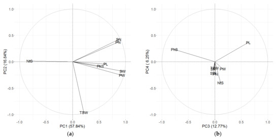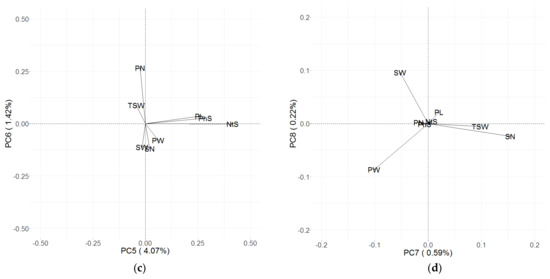 Variable factor maps demonstrating the relations between traits in PC coordinates (a) PC1 and PC2, (b) PC3 and PC4, (c) PC5 and PC6, (d) PC7 and PC8.