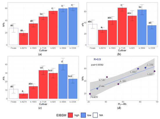 Characteristics of arbuscular mycorrhiza (AM) development by R. irregularis in the pea roots. (a) M% is the intensity of mycorrhizal colonization; (b) a% is the arbuscule abundance in mycorrhizal root fragments; (c) A% is the saturation of the root system with arbuscules; (d) relationship between the values of the pea stem length under conditions of monoinoculation with rhizobia (PL-Rh) and the values of intensity of mycorrhizal colonization (M%). The values for each parameter, which are not significantly different from each other (p ≤ 0.05), are marked with the same letter. Error bars represent standard errors. Markers of the rows of the diagram for high-EIBSM genotypes are highlighted in red, while those for low-EIBSM genotypes are highlighted in green.