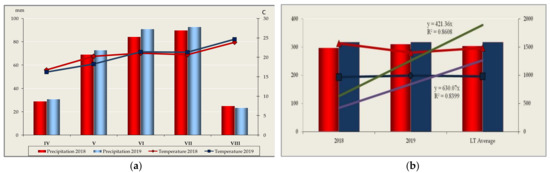 In August, there were more favorable conditions in 2018; there was 1.8 mm more precipitation, but temperatures were lower by 1.2 °C (23.9 °C) compared to 2019 (24.7 °C), which provided uniform maturing and greater yields.
