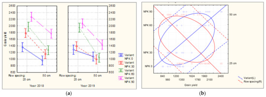 Effect of row spacing (cm), year, and nutrition variant (kg ha−1) on grain yield (kg ha−1).