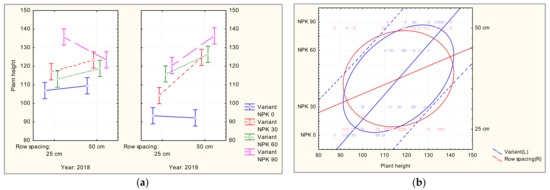 Based on the analysis of variance, it can be concluded that there are highly significant differences in the plant height between tested years (Fexp = 16.12 **), row spacing (Fexp = 31.75 **), and nutrition (Fexp = 120.27 **); see Table 5.