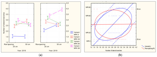On the basis of the ANOVA, the years, nutrition, interaction of RS × V, Y × V, and interaction of RS × Y × V had a significant influence on the NoLB (p < 0.05 and p < 0.01; Fexp = 10.010 **; Fexp = 33.420 **; Fexp = 31.080 **, respectively). The row spacing had a nonsignificant effect on the number of lateral branches, Fexp = 0.050 * and RS × V interaction, Fexp = 0.851; see Table 7. In 2018, there were significantly fewer lateral branches per plant compared to 2019 (p < 0.05).