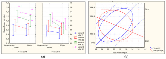 The mass of seed per plant (MSP) was significantly influenced by all factors examined (p < 0.01; Table 9, Figure 6a,b). On the basis of the ANOVA, the row spacing, years, and nutrition had a highly significant influence on the MSP (p < 0.01; Fexp = 7.6150 **; Fexp = 7.6151 **; Fexp = 18.6996 **, respectively). They had a nonsignificant effect on the interaction of the tested factor; see Table 9.