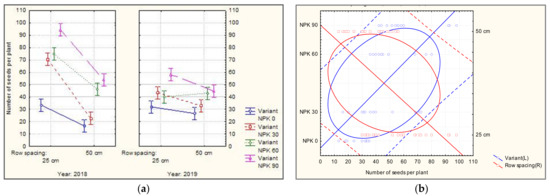 Effect of row spacing (cm) and nutrition variant (kg ha−1) on the number of seeds per plant.