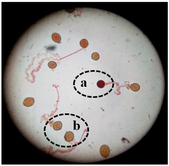 An example of results from the triphenyl-tetrazolium chloride (TTC) test. Viable pollen has changed to a red color (labeled as ‘a’) while non-viable pollen does not change color (labeled as ‘b’).