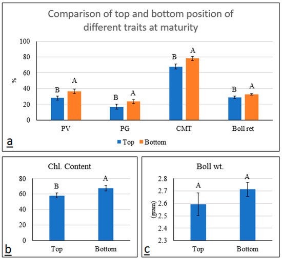 Means averaged across all genotypes to compare top and bottom positions of plants for different traits at maturity. The error bars are standard errors. The letters show Tukey’s mean comparison where different letters show significant differences between top and bottom positions for each trait. (a) PV (Pollen viability), PG (Pollen germination), CMT (Cell membrane thermostability) and boll ret (boll retention), (b) Chl. Content (Chlorophyll content), (c) Boll wt (Boll weight).