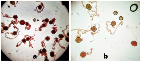 The triphenyl-tetrazolium chloride (TTC) test was used to test the viability of pollen grains [26]. Flowers that showed dehiscence of anthers were taken into the laboratory to test pollen viability. Fresh pollen grains were sprinkled on a glass slide (76 × 26 mm) by gently tapping the flower. Two to three drops of 0.5% 2,3,5-triphenyl tetrazolium chloride (Product no. 17779, Millipore, Merck, Germany) were added in a 15% sucrose solution (Product no. S0389, Sigma Aldrich, Merck, Germany). The slide was covered with a coverslip (20 × 20 mm) to prevent desiccation and then placed under sunlight for 60 min at 30–37 °C. After this exposure, slides were observed under a light microscope (Model XSZ 107BN, Manufacturer: Zenith Lab Inc., Zhejiang China). The pollen grains that changed to red color after exposure to the TTC solution were considered viable while non-viable pollen remained yellowish in color (Figure 2). Pollen viability percentage was estimated using the following equation: