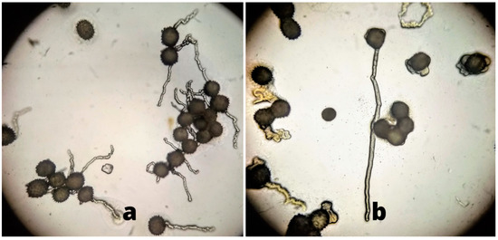 Flowers that showed dehiscence of anthers were collected from the field and immediately transported to the laboratory where pollen grains were deposited on pollen germination media. The media was prepared following the method explained by Burke et al. [9] with little modifications. The solid germination medium consisted of 2% (w/v) agarose (Product no. A4718, Sigma Aldrich, Merck, Darmstadt Germany), 25% (w/v) sucrose (Product no. S0389, Sigma Aldrich, Merck, Germany), 0.52 mM KNO3 (Product no. P8291, Sigma Aldrich, Merck, Darmstadt Germany), 3.06 mM MnSO4 (Product no. M7899, Sigma Aldrich, Merck, Darmstadt Germany), 1.66 mM H3BO3 (Product no. B6768, Sigma Aldrich, Merck, Darmstadt Germany), 0.42 mM MgSO4·7H2O (Product no. M2643, Sigma Aldrich, Merck, Darmstadt Germany) and 1.0 μM A3 gibberellic acid (Product no. G7645, Sigma Aldrich, Merck, Darmstadt Germany). The pH of the germination medium was brought to 7.6 before adding sucrose and agarose. The medium was autoclaved and poured into Petri plates (100 × 15 mm, Product no. P5856, Sigma Aldrich, Merck, Darmstadt Germany) under a laminar flow hood to avoid contamination. Plates were wrapped with cling film tape then placed in a refrigerator until used. Pollen grains with pollen tube lengths greater than the diameter of the pollen grains themselves were considered to be germinated (Figure 1). Percent pollen germination was estimated using the following equation: