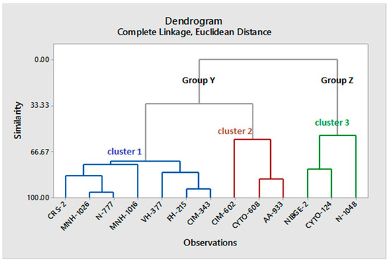 The clusters were divided into two groups Group Y and Group Z. Group Y included two clusters named cluster 1 and cluster 2 while Group Z included only one cluster named cluster 3. Cluster 1 included seven genotypes named CRS-2, MNH-1026, N-777, MNH-1016, VH-377, FH-215, and CIM-343 which represent 53.85% of total genotypes. Cluster 2 includes three genotypes named CIM-602, Cyto-608 and AA-933 represent 23.07% of total genotypes. In cluster 3, three genotypes are included named NIBGE-2, Cyto-124, and N-1048 representing 23.07% of the total genotype (Figure 6). The genotypes within each cluster exhibited similar behavior based on six traits used in this study. The genotypes in cluster 1 showed good performance based on boll weight. The genotypes grouped in cluster 2 are characterized by high pollen germination, pollen viability, chlorophyll content, and CMT. This indicated that the genotypes grouped in cluster 2 could be selected for the breeding program. The genotypes of cluster 3 were grouped by the lowest value of pollen germination, pollen viability, CMT, and boll weight (Table 7).