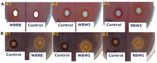 We performed qualitative analysis to understand the presence and/or absence of lignocellulolytic enzymes after SSF. Samples (WBRB, WBWS, and RBWS) demonstrated the clear circle around the disc that indicated the secretion and high activity of lignocellulolytic enzymes; however, control sample clearly showed the absence of circle around the disc, which could be related to the absence of lignocellulolytic enzymes (Figure 1). This confirmed that the agro-industrial waste as a substrate in SSF may promote the release of lignocellulolytic enzymes. Thus, WBRB, WBWS, and RBWS were selected for the subsequent quantitative studies based on their positive zone of clearance and enzyme secretion on the CMC as well as xylan-cultivated plates.