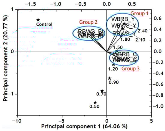 Bi-plot variables and scores of the first two principal components. WBRB = wheat bran + rice bran, WBWS = wheat bran + wheat straw, RBWS = rice bran + wheat straw, Y = yield, BI = browning index, and C = clarity. Control = pumpkin juice without enzyme extract, while ★ represents concentration of enzyme extracts (0.50 to 2.40) added to pumpkin juice. WBWS_C and RBWS_C in group 2 as well as WBRB_BI and WBRS_BI in group 3 were superimposed due to high similarity in their characteristics as shown by principal component analysis.