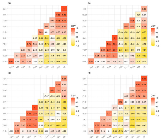 Heat map of sunflower trait correlations (average of all three hybrids); correlation thresholds: 0.05 = 0.576, 0.001 = 0.708; (a) sunflower × common vetch intercrop; (b) sunflower × red clover intercrop; (c) sunflower × alfalfa intercrop; (d) sunflower sole cropping; the magnitude of the correlation is denoted with a colour, whereby red indicates a positive correlation and yellow denotes a negative correlation. The stronger the correlation, the darker is the colour; HD-head diameter; OC-oil content; PHB-plant height in bud phase; PHF-plant height in flowering; SY-seed yield; TLAF-total leaf area per plant in flowering; TSW-thousand seed weight; NFSH-number of full seeds per head; OY-oil yield; SYH-seed yield per head; TLAB-total leaf area per plant in the bud phase.