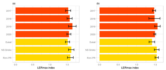 As mentioned, the LERmax value indicates the yield of sunflower in the first, and fresh legume biomass in the second year. Regarding all three hybrids, the study showed that LERmax for both sunflower × red clover and sunflower × alfalfa intercropping was greater than 1 (Figure 4), which indicates an advantage in utilizing land resources by this type of intercropping system relative to the corresponding sole crops. The higher average LERmax values were obtained in hybrids NS Gricko and Rimi PR intercropped with red clover (1.6), resulting in a positive impact on land and a clear yield advantage. More precisely, 60% more land area is needed in sole cropping to gain the same yield obtained as in NS Gricko and Rimi PR × red clover intercropping. The lowest average LERmax values were obtained in Dukat × alfalfa intercropping (1.4), indicating that at a 40% larger area is needed for the same yields to be obtained in sole cropping. Comparing the years of study, the highest LERmax values were achieved in 2019/2020.