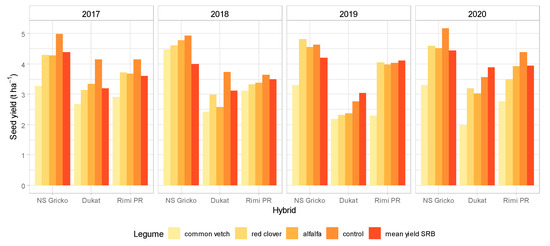 In addition to the sustainability of the production system, it is very important to achieve the desired sunflower yield as it is the most important agronomic trait. Accelerated climate change characterized by extreme climatic hazards exposes the sunflower, a spring-sown and usually rain-fed crop, to the direct effect of heat stress and different drought scenarios, which can result in great yield losses and oil content decrease [26,27]. The above-mentioned claims indicate variable and unpredictable conditions during the growing season, which was confirmed by four different vegetation seasons in which the experiment was performed. Figure 5 shows the yield data from our trial compared to the data from multi-environment trials for hybrid performance evaluation. At each trial year, the yields of sunflower intercropped with red clover and alfalfa were similar to the averages from multi-environment trials (same year).