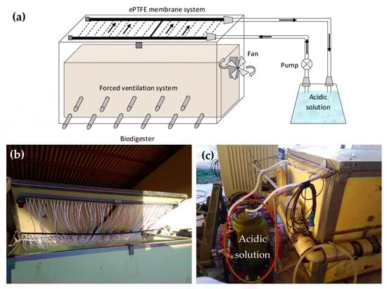 System S1: (a) schematic of the gas-permeable membrane system for NH3 capture installed inside the closed aerobic composter; (b) pilot-scale closed aerobic composter with ePTFE membrane installed in the inner face of the lid; (c) acidic solution tank (highlighted in red).