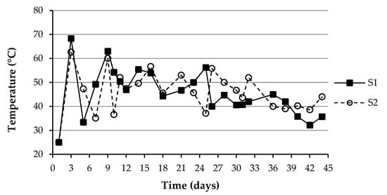 The daily average temperature of the composting mixture during aerobic composting in S1 and S2 is shown in Figure 3. In both cases, at the beginning of the composting process, the mixture’s temperature rapidly increased (up to 68 and 62 °C in S1 and S2, respectively) within 3–4 days and remained between 40 and 60 °C almost until the end of the process. Forced ventilation provided oxygen for the bacteria to decompose the organic matter, increasing the temperature. Subsequently, the temperature gradually decreased to values between 30 and 40 °C. The temperature drop after the third day is attributed to a programmed low aeration frequency (10 min/24 h), which should probably have been more frequent at the beginning of the process to maintain good bacterial activity. The peaks observed during the temperature decrease are due to the recovery of the mixture temperature after a period of ventilation. The temperature variation during the composting process was adequate for uniform and efficient mixture decomposition and was consistent with that reported by other authors [56,64,65].