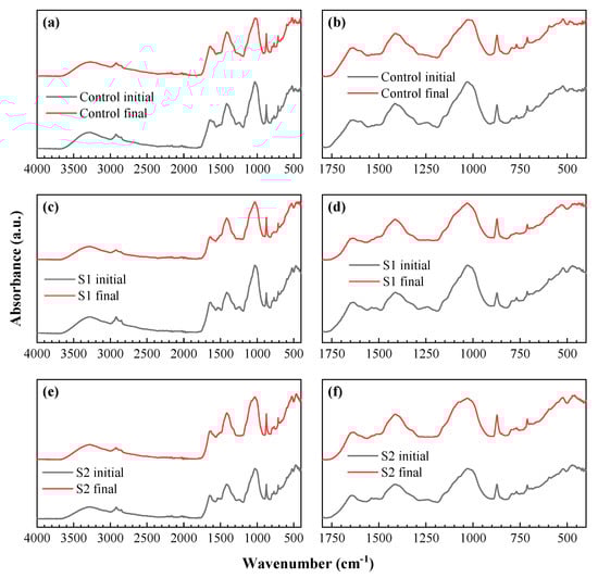 ATR−FTIR spectra of hen manure and wheat straw mixture samples at the beginning of the experiment and after 44 days for: (a,b) the control, (c,d) S1, and (e,f) S2 treatments. (a,c,e): spectra of each treatment over the whole 4000–500 cm−1 range; (b,d,f): fingerprint region (1800–400 cm−1 range).