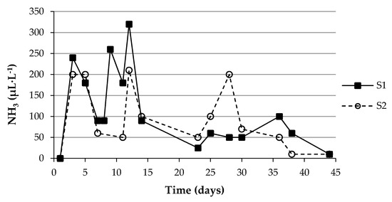 Ammonia emissions (in ppm) inside each portable closed aerobic composter are shown in Figure 5. Ammonia emissions peaked in both systems on day 12 of the process, reaching 320 ppm in S1 and 210 ppm in S2, after which they decreased to 10 ppm on the last day. These results are consistent with those obtained by authors such as Sun et al. [56], who obtained a maximum concentration of NH3 ranging from 500 to 600 ppm inside the membrane between days 1 and 10 of the composting period, or Chowdhury et al. [66], who found maximum emissions on the 6th and 11th day of the process. Previous studies have shown that NH3 release in compost is mainly concentrated in the thermophilic period and gradually decreases in the maturity period [81].