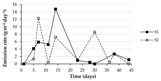 The NH3 emission flux was highest in the early stages of the composting period in both systems, reaching a maximum value of 14.7 g·m−2·day−1 on day 14 for S1 and 12.3 g·m−2·day−1 on day 7 for S2, although in this case high values were also observed on days 14 and 30. The average emission rate was 3.5 and 3.4 g·m−2·day−1 for S1 and S2, respectively. Ammonia production during composting is related to the degradation of easily degradable organic substances, which is characteristic of the early stages of composting [56], so it is reasonable to obtain the highest emission rates in the first weeks.
