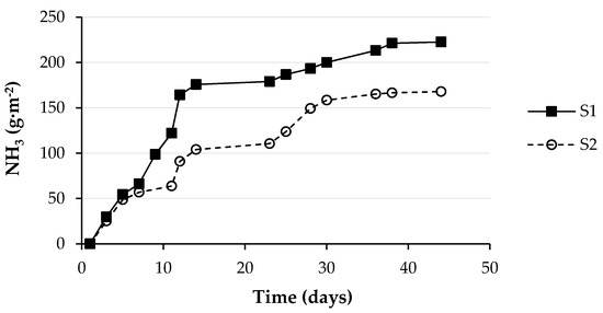 The accumulated NH3 emissions during the 44 days of the composting process in the air chamber of the closed aerobic composting reactors of systems S1 and S2 are presented in Figure 7. The cumulative NH3 emission from day 0 to day 14 in the S1 system was 1.7 times the value reached in S2. The difference was progressively reduced and, at the end of the experiment, on day 44, it was 33% higher (223 vs. 168 g·m−2). The values found are similar with small differences due to the heterogeneity of the compost mixture.