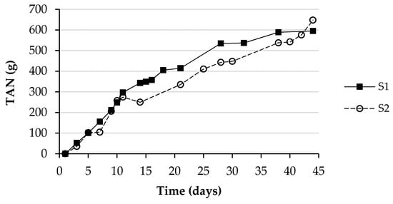 The TAN values (expressed in g) for systems S1 and S2 over the 44-day period are shown in Figure 9.