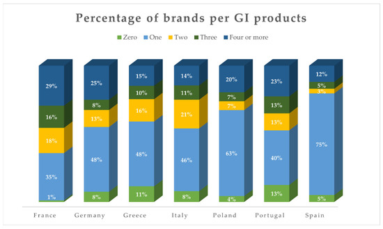 Another aspect of the market is the ratio of GI registers related to the number of brands found in the survey in each country. Figure 1 shows that most GIs do not appear in the market in many brands. Additionally, no country had more than 29% of GIs with four or more brands in its supermarkets in all surveyed countries. In this case, France was the one with the most relative variety of brands in GIs. On the other hand, Spain had 80% of the GIs found under only one brand or no brand.