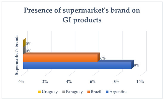 Figure 4 above shows the result of the corresponding percentage of GIs with at least one private label among the supermarkets observed in each Mercosur sampled country. Again, the results point to a rare presence of these brands in the market in question. The lower highlights are due to Uruguay and Paraguay, where no GIs have a brand of their own in the markets observed. At the other end, Argentina stands out, where 9% of the GIs found have their own brands in the supermarkets sampled. Again, however, the demonstrated sample opposes that found in the EU.